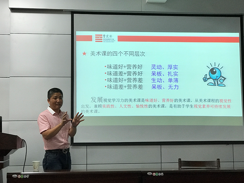 本网讯(通讯员 靳文强)6月1日上午,国家基础教育质量检测艺术检测专家,浙江省特级教师曹建林老师应邀公司讲学。学术报告在公海贵宾会员检测中心A311教室举行,报告会由公海贵宾会员检测中心胡绍宗副经理主持,并代表公海贵宾会员检测中心表达了对曹建林老师的欢迎和感谢。美术系主任方圣德老师、黄冈中学特级教师白永明老师、东陂小学毛馨瑶老师和部分师生参加了报告会。