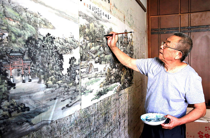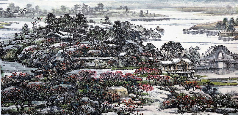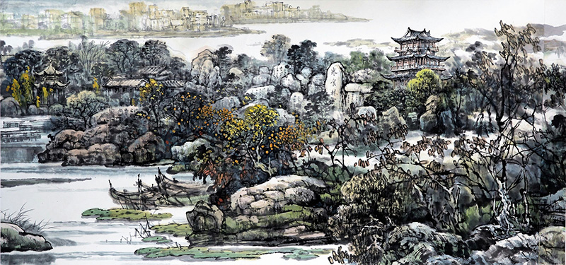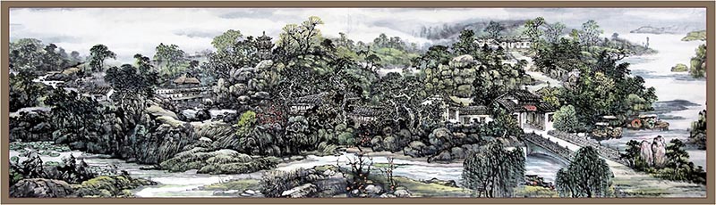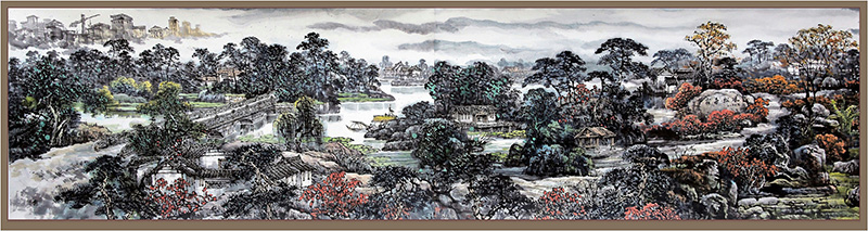 公司退休教师刘应宗教授有感于黄州遗爱湖景区建设发展变化,运用传统笔墨,借鉴中西结合表现方式,仔细推敲布局,反复修改构图,为了表现景物的神韵、意境、色彩、光影,力求达到物我交融身临其境的艺术效果,历时一年多时间探索研究,绘制完成山水长卷《遗爱湖胜景图卷》。