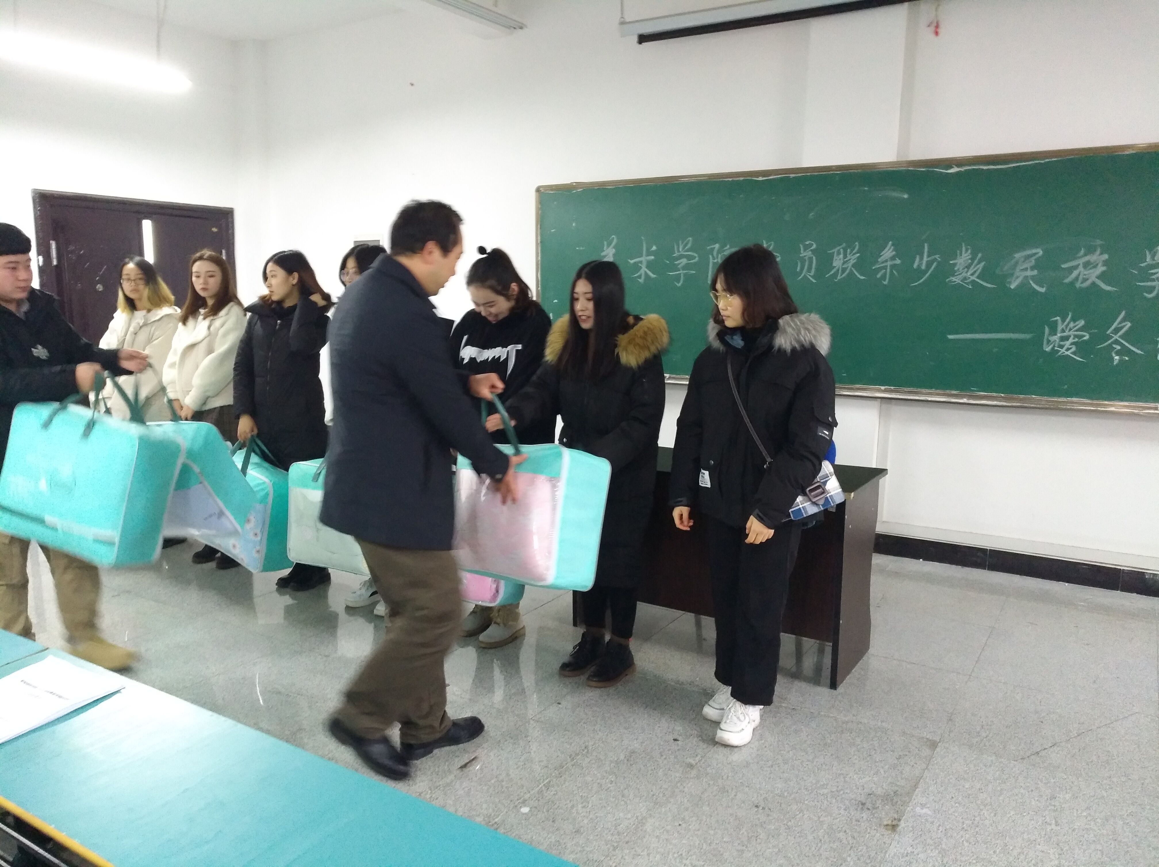 会议伊始,公海贵宾会员检测中心团委组织部副部长王丽同学代表学院宣读了员工党员和少数民族员工之间的互助关系安排,随后,马书记亲自为少数民族的同学发放暖冬物资。