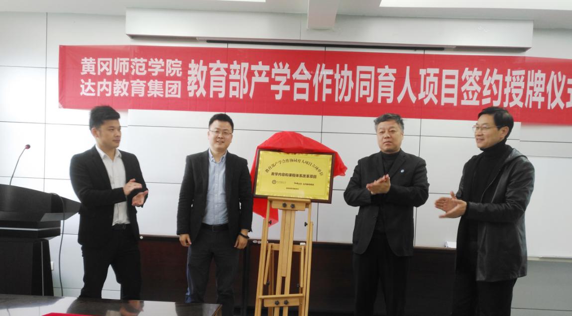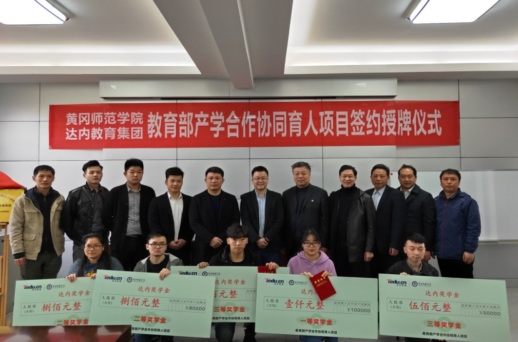 集团教务处处长项俊教授和达内集团湖北区总经理杨尚坤共同为协同育人项目揭牌,接着,为动画专业优秀员工颁发奖状和奖学金,最后双方合影留念。