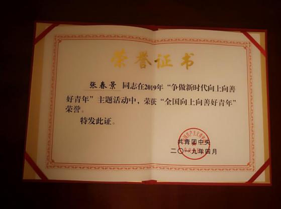 在纪念五四运动100周年之际,共青团中央公布了2019年“全国向上向善好青年”名单,公海贵宾会员检测中心客座教授张春景光荣上榜。