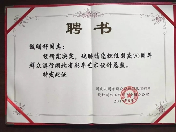 本次湖北彩车的设计由甄明舒博士的团队主持设计,由湖北在汉高校科研团队制作完成。整个设计制作项目历时八个月,经过四个阶段,设计方案最终受到湖北省领导和社会各界的充分肯定。 甄明舒的设计方案在众多方案中脱颖而出,获得了一等奖。