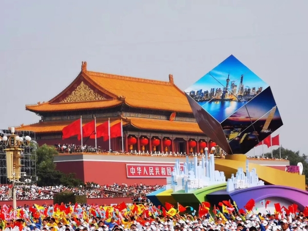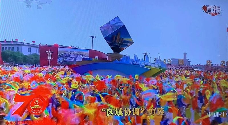 这是国庆70周年庆祝大会上的“区域协调”方阵彩车。彩车上,京津冀、长江经济带、粤港澳、长三角,“四大战略”齐头并进;西部开发、东北振兴、中部崛起、东部率先,“四大板块”协调发展。