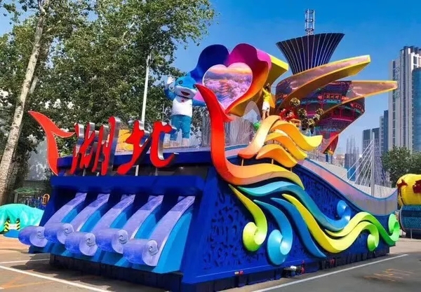 湖北彩车高10米,宽6米,长15米,重量达30吨。车头,三峡大坝气势如虹;两只五彩“楚凤”贯穿整个车身两侧,昂首而立,展翅欲飞;车顶,长江汉江两江交汇汇成一滴水,也凝成一颗“芯”,象征中部六省的六块花瓣上,镶嵌着六块异形彩屏,簇拥着光谷未来城马蹄莲;蔚蓝色的车身雕刻着楚绣的龙凤虎纹。