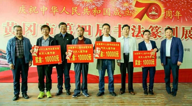 王立兵、王建明、童德昭、柳长青等向全国第十二届书法篆刻展黄冈入展作者周国富、陈逸、张志刚、谈维,以及本届展览20名优秀作者颁奖。