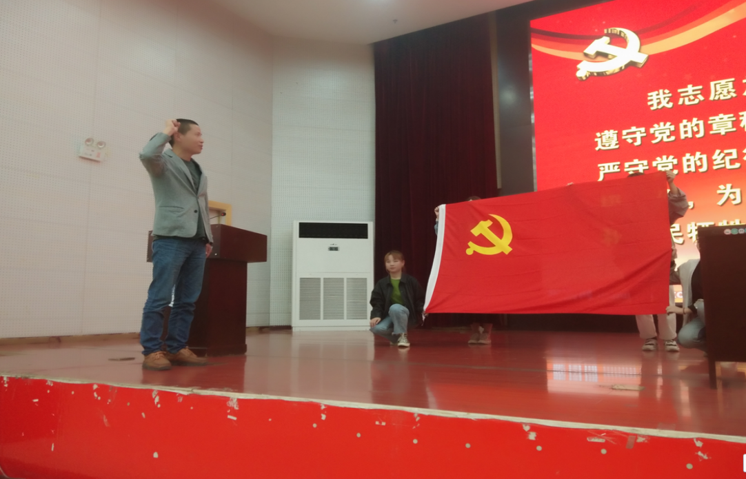 全体师生党员在童坤老师的带领下重温入党誓词,面对党旗,再一次举起右手,庄严地向党组织宣誓。