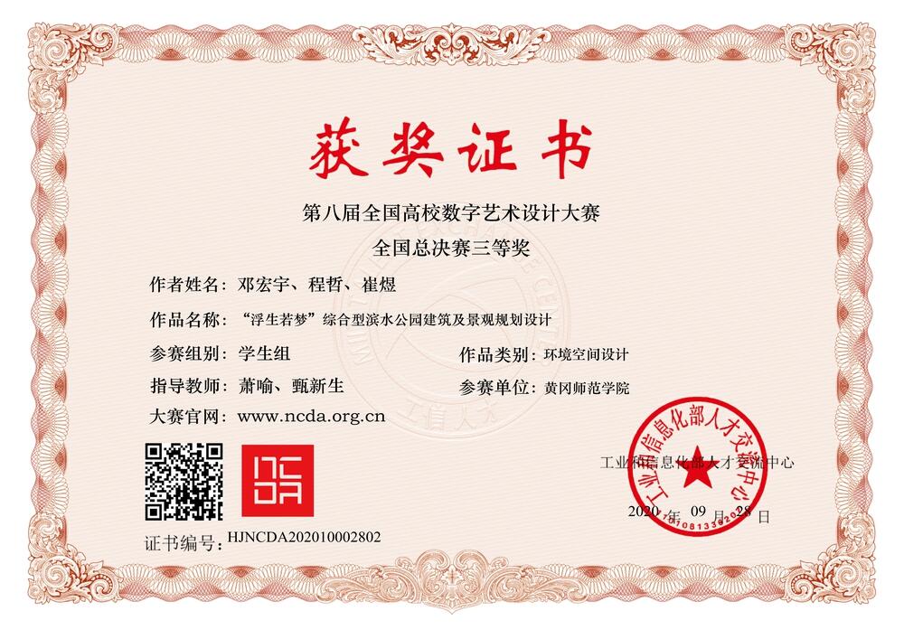 日前,第八届全国高校数字艺术设计大赛(国赛)颁奖盛典在浙江嘉兴圆满落幕。公海贵宾会员检测中心选送的作品获得全国总决赛一等奖2项、二等奖2项、三等奖2项。徐娴老师指导,刘顺依、李丽娜创作的数字影像作品《雨》,陈亭君、朱佳鑫创作的数字影像作品《午夜追凶》获一等奖;陈方老师指导,程蕾创作的数字绘画作品《魔女的房间》,刘颖老师指导,沈顾汨创作的视觉传达设计作品《去年相送》获二等奖;萧喻、甄新生老师指导,邓宏宇、程哲、崔煜创作的环境空间设计作品《“浮生若梦”综合型滨水公园建筑及景观规划设计》,晏俊老师指导,刘雨芬、韩玉茹、陈贝妮创作的环境空间设计作品《阅见墨趣一宜昌市乐天溪镇图书馆概念设计》获三等奖。徐娴、陈方、刘颖、萧喻、甄新生、晏俊六位老师获“优秀指导教师奖”。因成绩斐然、赛事组织工作优秀,学校荣获“优秀组织奖”。