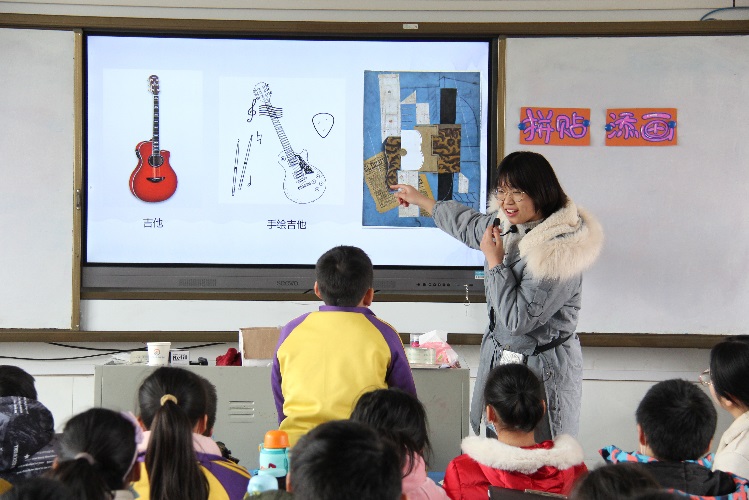 上午第四节课,大家在五(1)班观摩了实习生杜蕾的美术课《拼贴与添画》,这是一节综合·探索领域的课程。杜蕾声音洪亮,教态生动大方,与员工互动融洽有效,体现了较强的课堂驾驭和教学组织能力。杜蕾首先引导大家感受利用综合材料创作美术作品的途径和方法,启发大家积极思考,员工参与度很高。在课堂练习中,杜蕾鼓励大家突破材料的局限和造型观念的程式化思维,同学们分小组合作进行创作,教学秩序井然,作品形式多样,效果较好,课后老师在黑板上分享了部分小组的作品。