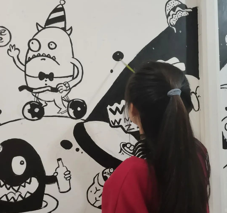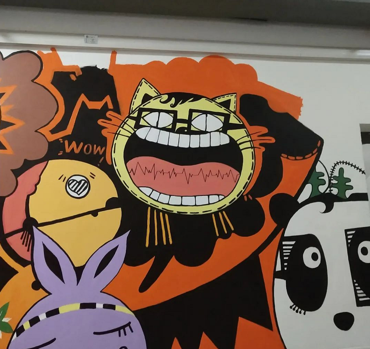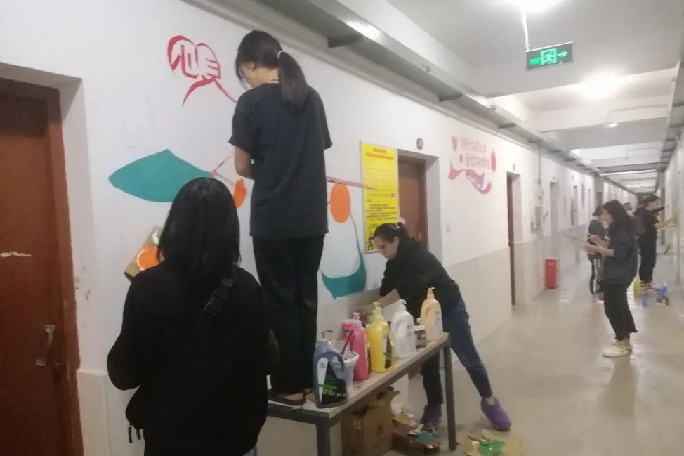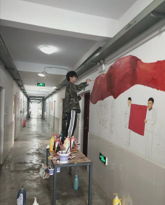 在柳园十栋宿舍,同学们带着满满的热情,纷纷拿出自己的专业水准,打草稿,定位置,选配色,选照片,牺牲自己休息和玩乐的时间,从白天到夜晚描绘墙壁,将宿舍装扮的生机勃勃,整栋宿舍充满着艺术气息。此次宿舍墙绘活动体现了美院学子团结友爱,和谐向上的良好风尚,也为宿舍增加了一道亮丽的风景线。