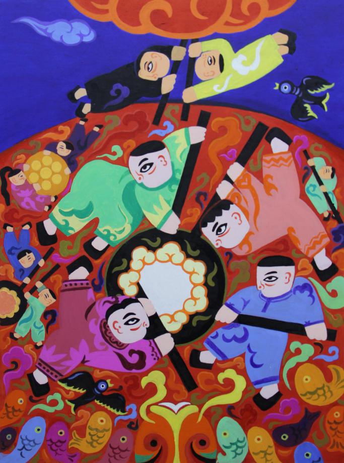 蔡小平教授的作品《打糍粑过大年》,通过打糍粑这一黄冈民间过年习俗,生动地描绘了大别山农村热火朝天打糍粑的场景,糍粑始终与圆相伴,在中国圆象征着和谐,圆糍粑又像古钱,打糍粑不仅是农民庆祝节日的一种喜悦形式,同时是祈福新的一年丰收,奔小康的美好愿望。