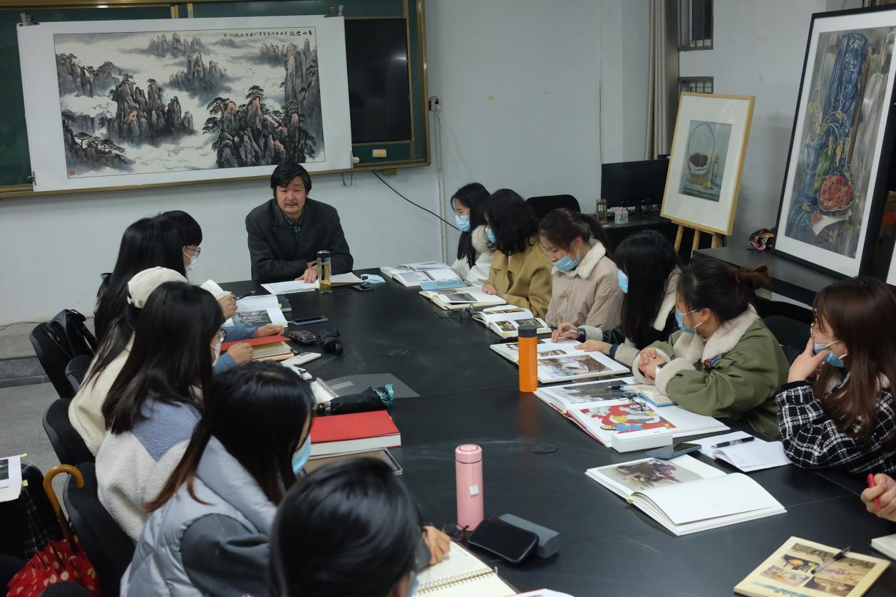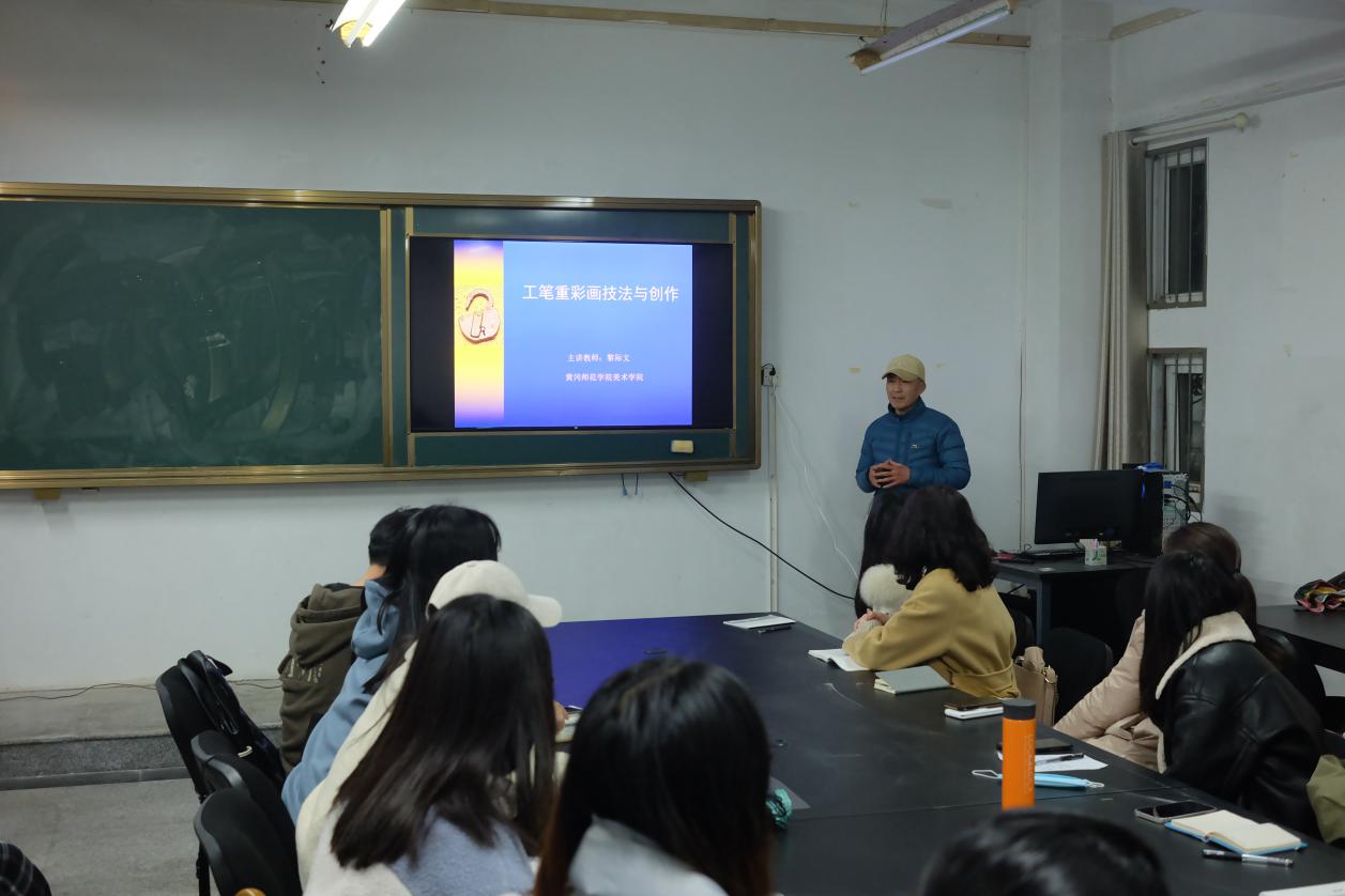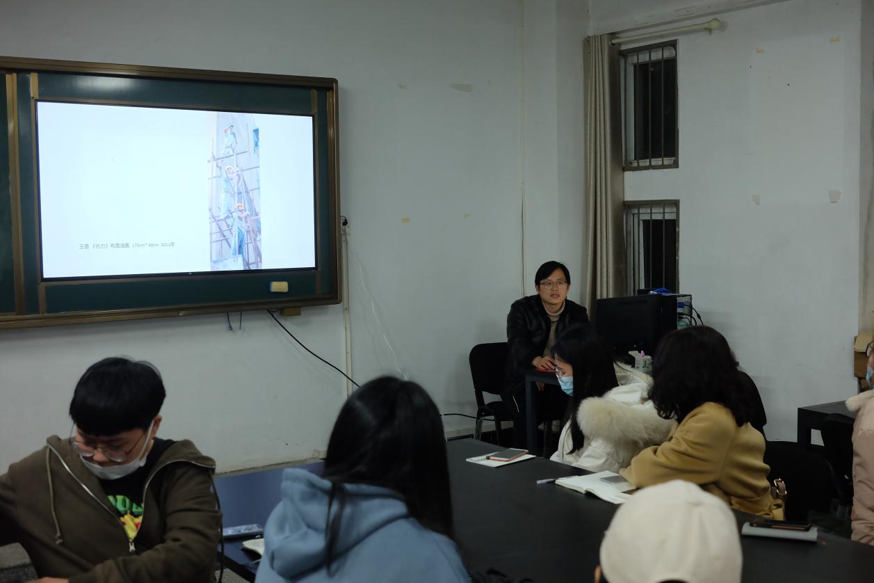 冯松涛教授结合作品梳理了自己三十余年的艺术创作经验,他从内容与形式、生活与情感、实验与创新等角度阐释了艺术创作的一般规律和方法,其中对现实生活、个人情感、艺术材料和语言的探索始终是其艺术创作的源泉动力和风格归属,而对艺术的执着热爱和持之以恒地勤奋耕耘才是收获艺术果实的必经之路。他勉励同学们珍惜宝贵的学习时光,融入新时代社会文化建设中来,在理论和实践上都要忙起来,为未来的教师岗位和使命做好准备。