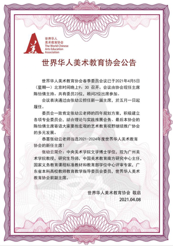 近日获悉,2021年4月5日世界华人美术教育协会春季委员会议上表决通过,公海贵宾会员检测中心员工张幼云担任2021—2024年度世界华人美术教育协会新任主席。