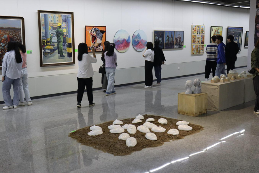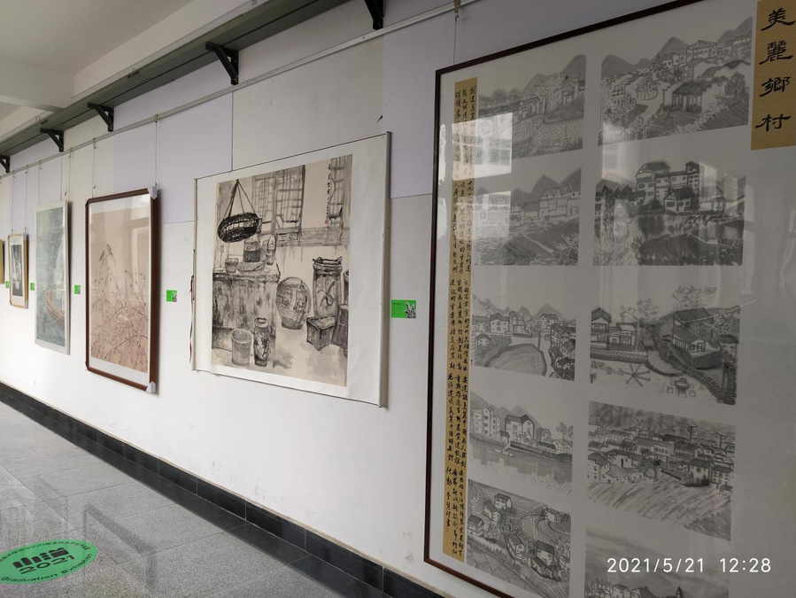 在美术楼一楼展厅、闻一多美术馆,动画演播厅、视觉传达设计工作室,一、二楼走廊随处可以看到毕业生们创作的作品。作品包含书画、动画影视、工艺手工、雕塑陶艺、装饰设计、建筑环境设计等多个种类,浓厚的艺术气息为大家带来视觉、精神上的艺术享受。