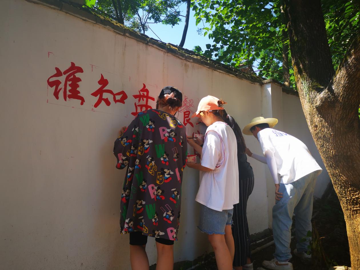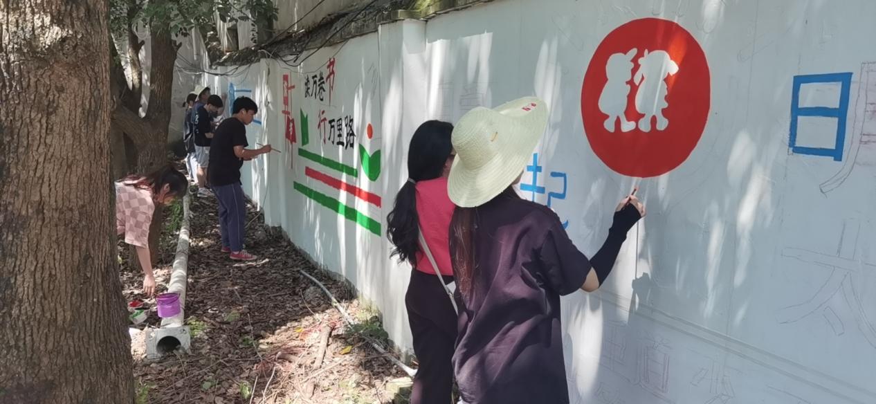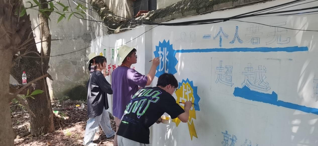 出发前,带队老师与当地负责人进行了细致交流,根据学校的实际情况进行主题和图样的讨论并形成了详细的实施方案,因此一到现场,同学们迅速分工,按照分组进行绘画,整个彩绘过程有条不紊,井然有序。部分同学负责墙面起稿,其余同学帮助洗笔、分色、调色等准备工作,在进行基础的上色后,同学们对色调进一步调整,使作品更加完善。