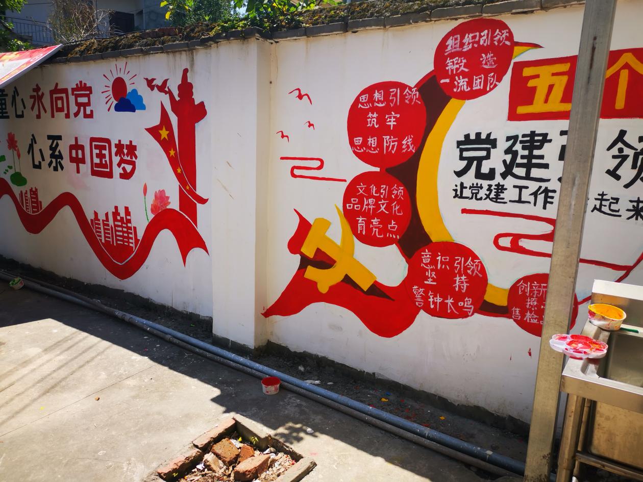 此次活动是公司党员师生和志愿者们学党史、办实事的重要举措之一,公司党委副书记陶莎,员工党支部书记周稳,学院团委书记赵震南以及员工党员、入党积极分子、“曙光乡建行”团队志愿者共56人参与了墙绘,学校组织员李斌书记共同参与了此次活动。