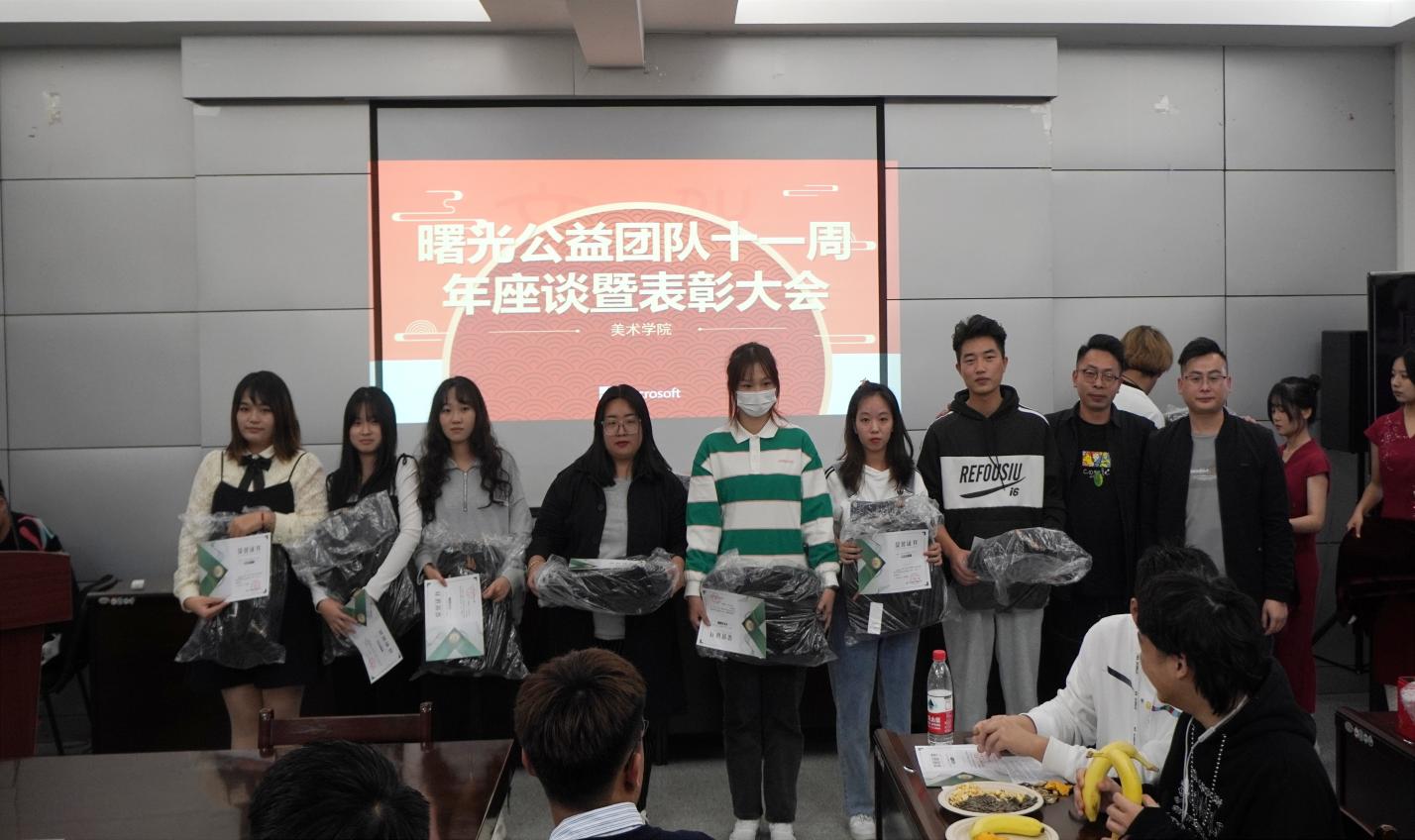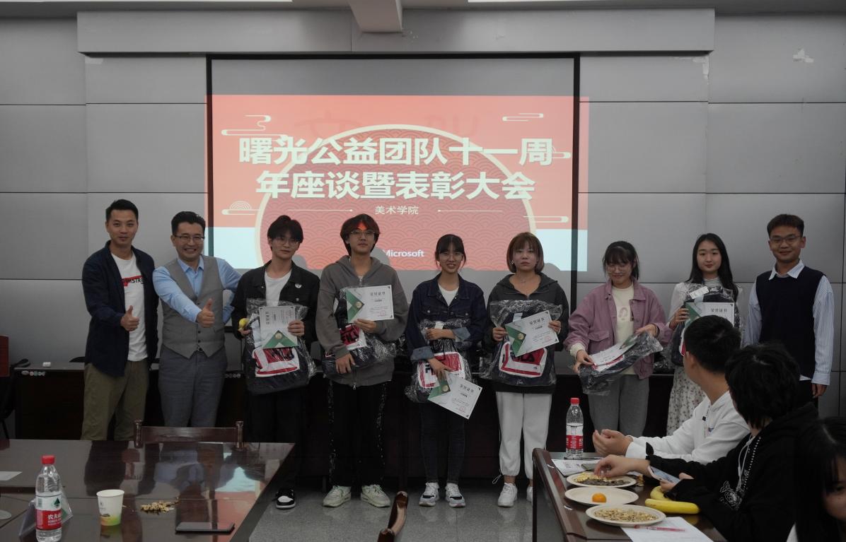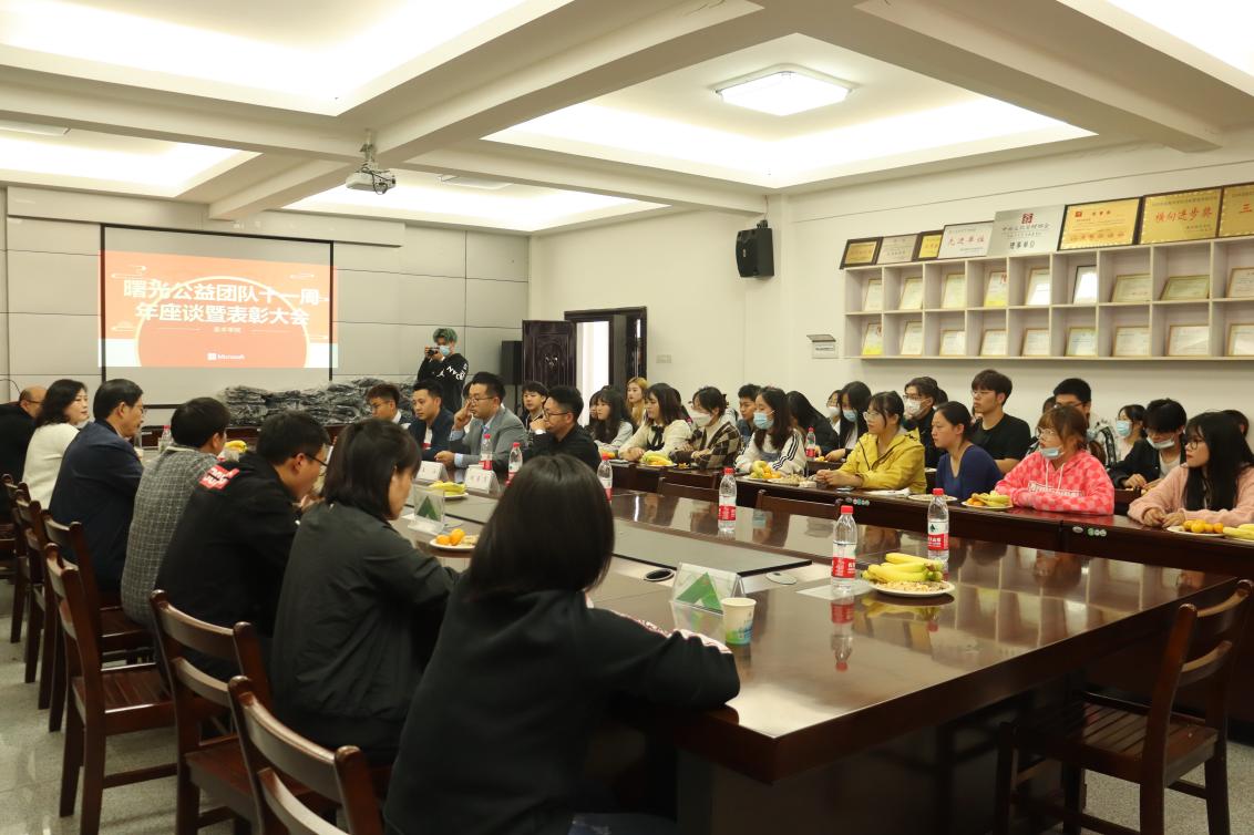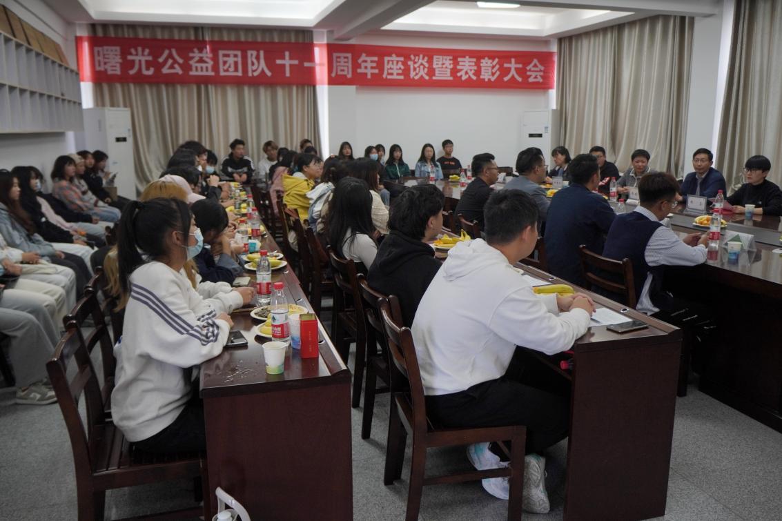 2021年10月29日下午15:00,曙光公益团队十一周年座谈暨表彰大会在美术楼A311会议室举行。会议邀请到团队第一任指导老师陈剑光、王娟,团队历届队长代表姜仲祥、刘䶮、吕璞,一直对团队活动给予支持的优秀员工王江、向东京,以及曙光公益团队现任全体指导老师及队员参加座谈会,会议由公司党委副书记陶莎主持。