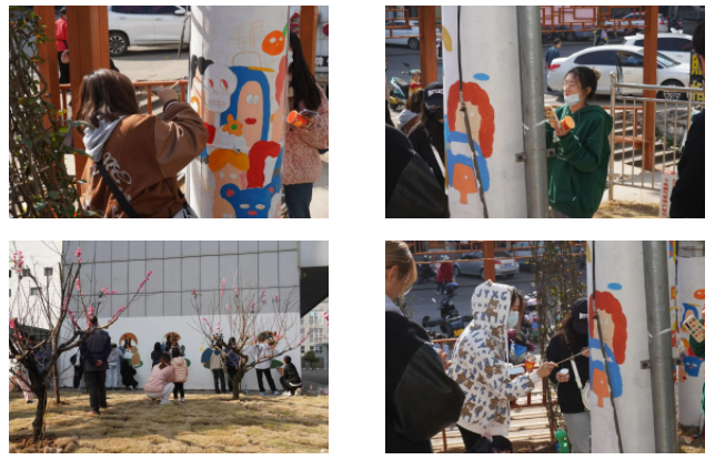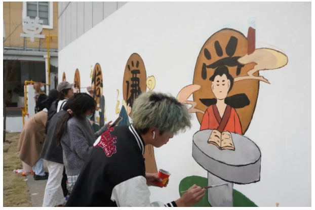 在绘画的过程中,大家充分利用所学专业知识,发挥想象能力和艺术思维对墙面内容进行设计和构思,很快就明确了画面的大致效果,同时也引来不少路人驻足围观。待绘制完成后,同学们手上和身上虽沾上了些许颜料,但脸上却洋溢着灿烂的笑容,面对成果大家都成就感满满。