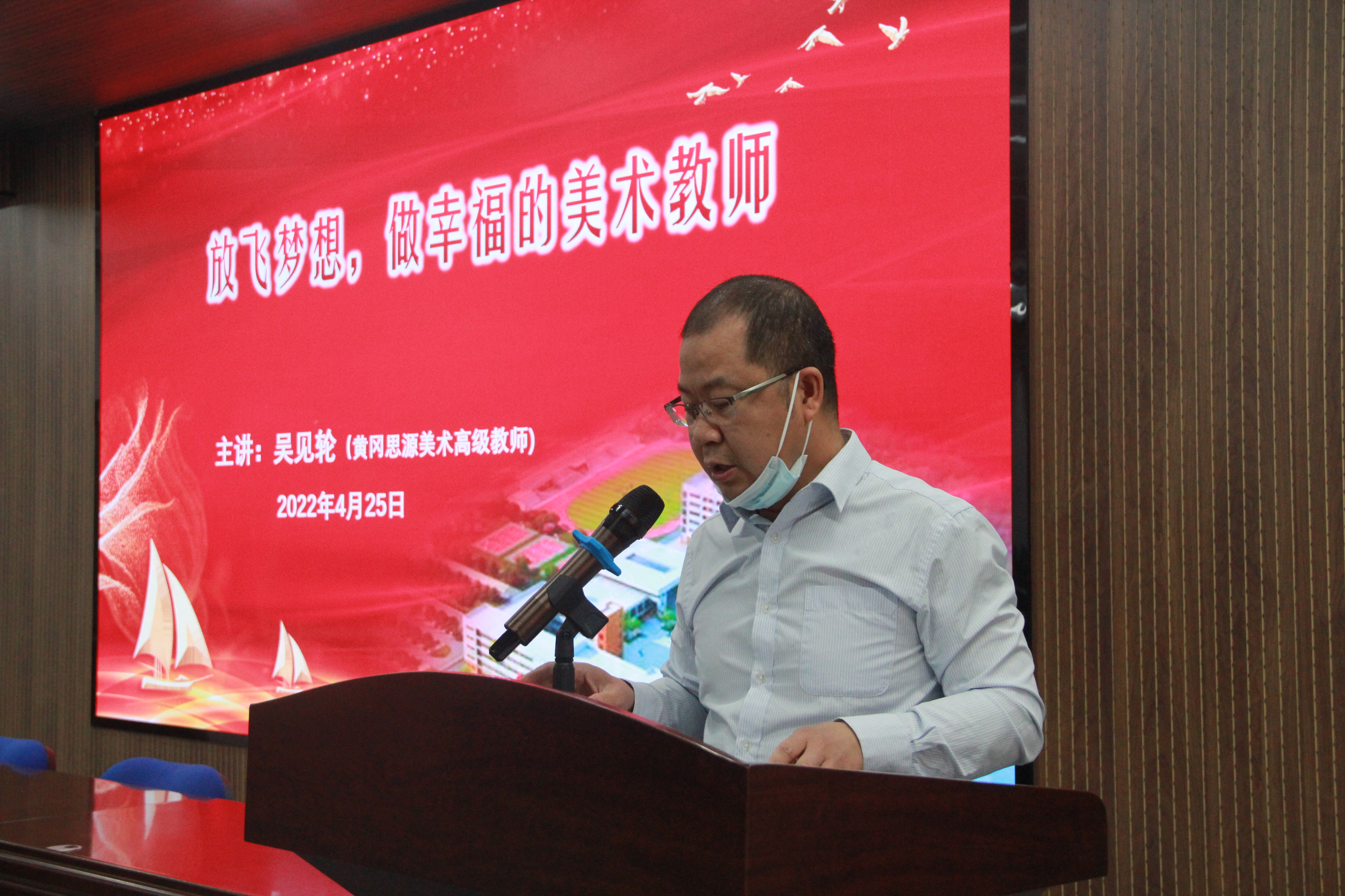 为了更好的让同学们领会教育见习的意义,美术学系邀请了黄冈思源实验学校的高级美术教师吴见轮为同学们作“放飞梦想,做幸福的美术教师”的主题讲座。袁朝辉副经理首先对吴见轮老师进行了详细的介绍,勉励同学们向吴老师学习,学习他投身新时代社会主义教育事业的高尚情怀和成为教学骨干、教学名师的职业理想。