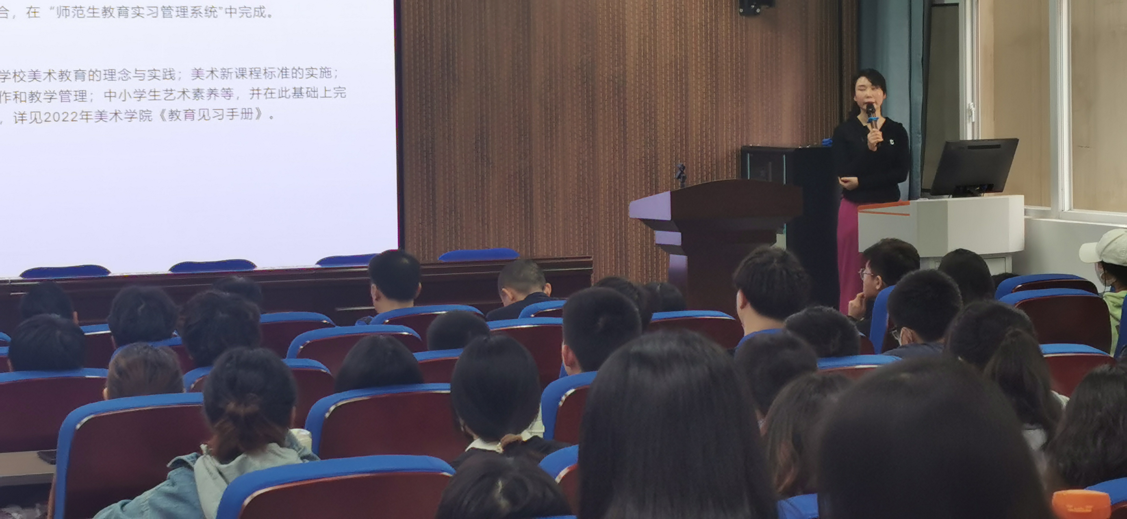 美术学系副主任童坤首先结合《美术学(师范)人才培养方案》和教育部师范专业认证要求对《教育见习》的课程性质、课程目标、组织实施办法、课程达成度主要观测点及课程考核评价方法作了说明。