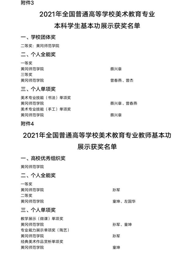 近日,教育部网站公布了2021年全国普通高等学校音乐教育专业、美术教育专业本科员工和教师基本功展示评选结果,公海贵宾会员检测中心师生在此次展示中取得佳绩,孙军、童坤、左国华三位教师和美术学2018级蔡兴章、曾春燕、曾杰三位同学共获得15个奖项,学校获得“高校优秀组织奖”和“学校团体奖二等奖”。