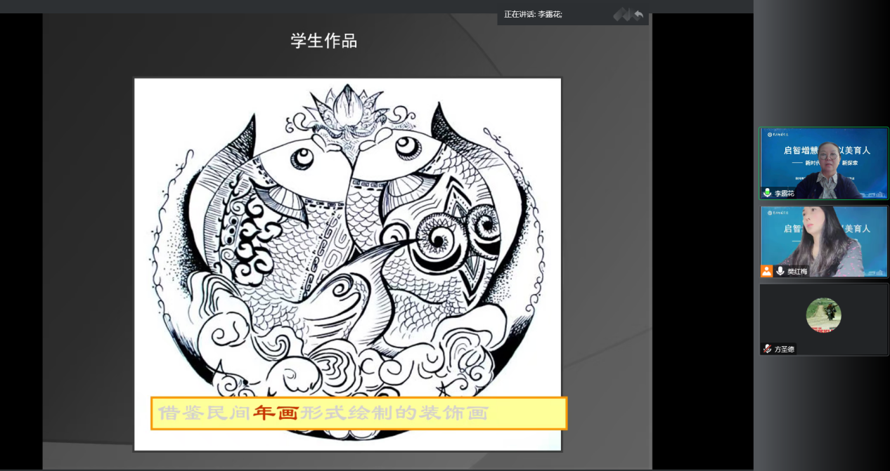 在第一部分讲座中,李老师表达了自己对美术教育的热爱和对美术教学创新的追求,以“备一堂课当作研究来钻研课堂”“为员工布置作业当作创作来完成”的教学理念,深深地领悟到从事美术教育行业中的幸福与快乐。李老师还将美术教育课堂练习与我国重要热点和大事相结合,强调文化是美术教育的国际趋势,美术课程与文化的关系体现了不同时代和地域美术的特征。通过关注文化,理解文化,建立文化自信,弘扬中华精神。