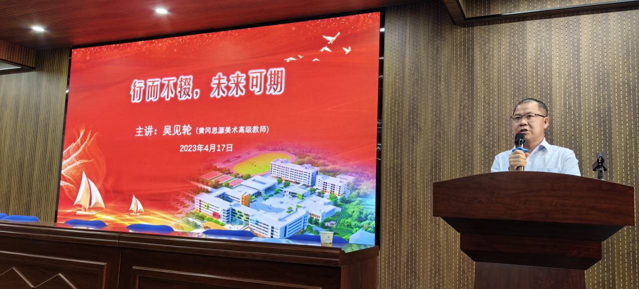 会议邀请了黄冈美育名师、黄冈思源实验学校高级美术教师吴见轮为全体研究生带来《行而不辍、未来可期》的专题讲座。吴见轮老师的讲座围绕任教以来的心路历程、当今学校需要怎样的美术老师、正确对待教育见习和研习工作、教师职业展望四个方面展开。吴老师勉励同学们不断完善自身综合素养,践行师德素养,争做“四有好老师”。