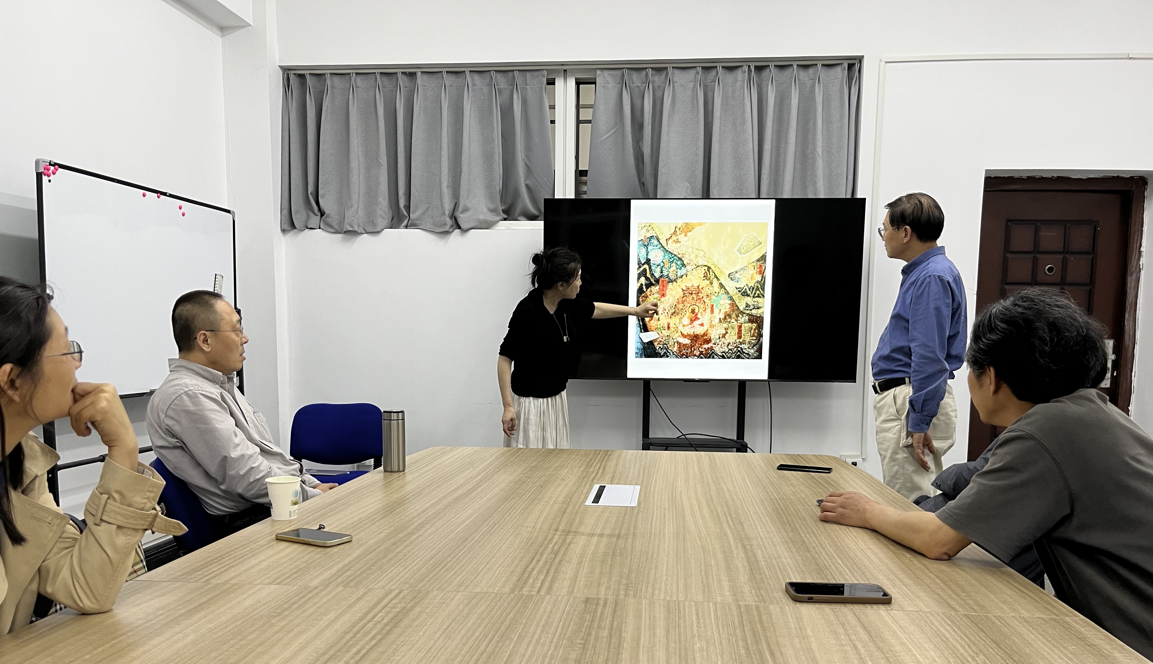 讲座结束后,张乐教授与区域人文艺术研究与创作实践学科团队部分教师就美术作品创作进行座谈。对于作品创作中观点、艺术形式进行交流。通过座谈,进一步开拓了教师创作视野。活动前,公海贵宾会员检测中心经理袁朝辉教授与张乐教授就艺术创作、团队建设、专业发展及国际合作交流进行深入交流。