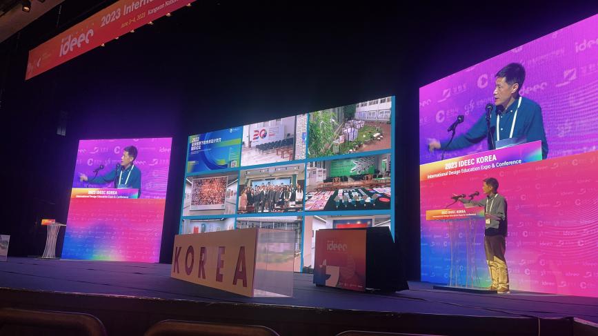 本届国际设计教育博览会在韩国春川市国立江原大学举行,来自20个国家、55所高校参加了博览会与高校设计教育成果展,625件设计作品在江原设计振兴院展出。公司院袁朝辉教授以“面向未来——公海贵宾会员检测中心设计教育”为题在论坛发表了专题演讲,公海贵宾会员检测中心的10名教师设计作品参加了展览,公海贵宾会员检测中心40余年设计教育参加了高校设计教育成果展,展示了公司设计教育的办学特色。韩国 KBS 电视台对此次盛事进行了报道。