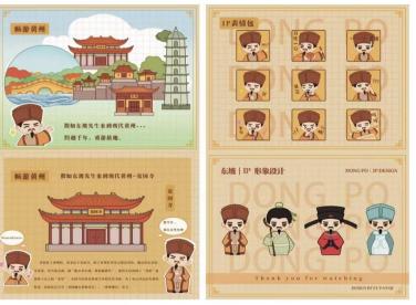 一等奖:《东坡 IP 人物形象设计》 傅泮淇 本作品以苏轼在黄州时给白己取名“东坡 居士 ”为原型创作的 IP 形象,整体造型结合苏较本人性格特点,采用比较方園的线条设计, 表达东坡先生在黄州时积极应对人生困境,迎难而上的人生态度。以“假如东坡先生来到现代黄州,跨越干年,重游故地 ”为主顾内容,对东坡先生管经在黄州生活居住过的环境和现代进行融合展示。