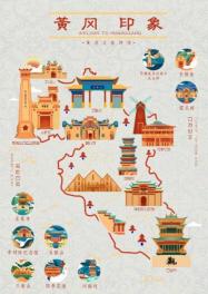 二等奖:《黄冈印象》 刘娅琴(指导老师 王丹) 将黄冈各个县的标志性建筑用扁平 风格表现出来,重点突出建筑的美观特色,背景则是当地标志性风景山岭或动植物。主要用 在文创旅游产品,衍生系列徽章、台灯、黄冈地图等文创用品,一方面能带动当地旅游消费,另一方面这也是一个宣传和保护大别山红色文化的机会。