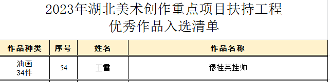 近日,湖北省文化和旅游厅公布2023年度湖北省美术创作重点项目扶持工程评审结果,公司教师王雷的作品《穆桂英挂帅》(油画)成功入选。