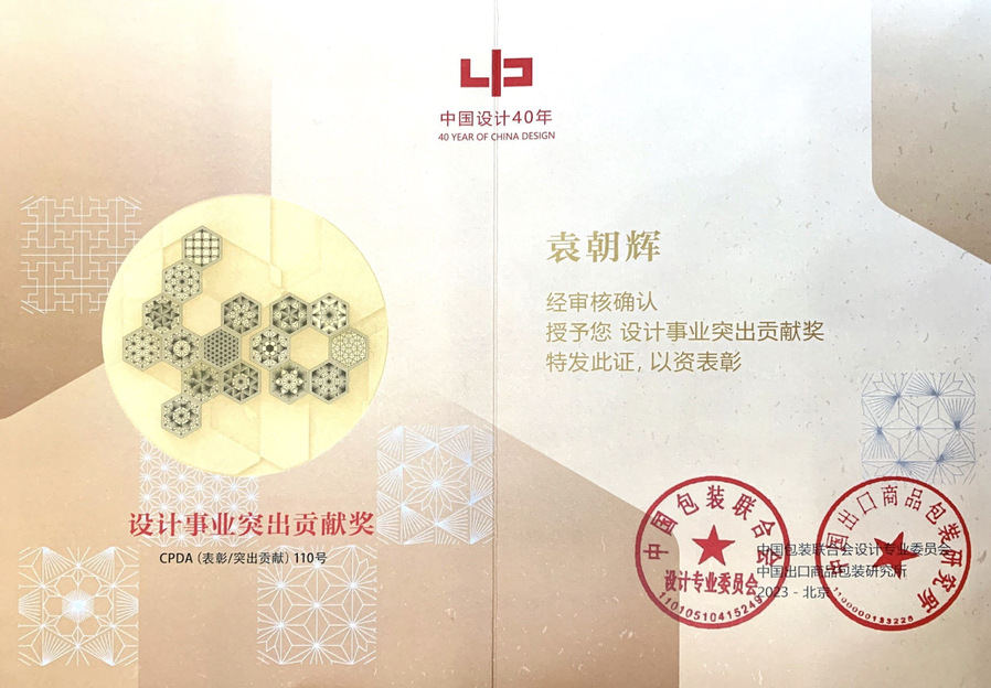 袁朝辉教授从事设计事业30年,设计作品在国内外获奖、参展100余次。担任了中国包装联合会设计专业委员会全国委员,中欧国际设计文化协会(CEIDA)理事、韩国京畿设计协会海外理事、中韩创意设计协会学术顾问、中国电子视像行业协会数字影像创意工作委员会副主任委员等学术职务。他的设计作品强调从中国传统哲学思维方式上寻根,同时又注重开放包容、交流互鉴,不断创新艺术表现形式,扩大传播路径,以作品为媒介传播中华民族精神品格,为中国设计事业发展作出了突出贡献。