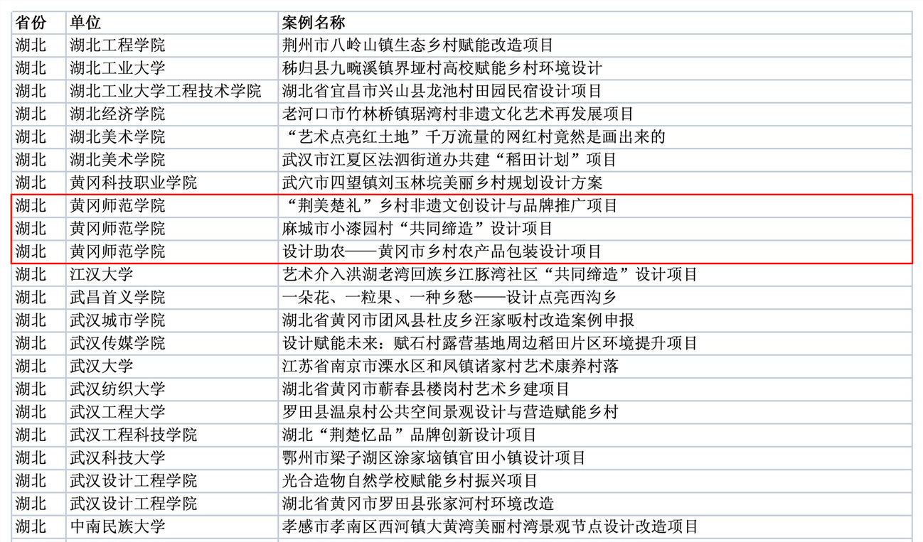 据悉,“全国高校设计赋能乡村振兴创新案例”征集活动由民政部直管智惠乡村志愿服务中心和未来设计师大赛(教育部A类学科赛事)组委会联合举办,鼓励高校设计学科赋能乡村振兴,发挥学科竞赛“立德树人”功能,得到“学习强国”学习平台,人民网,新华网,半月谈等媒体的报道和展播。第二届“全国高校设计赋能乡村振兴创新案例”湖北省高校案例仅入选22个。