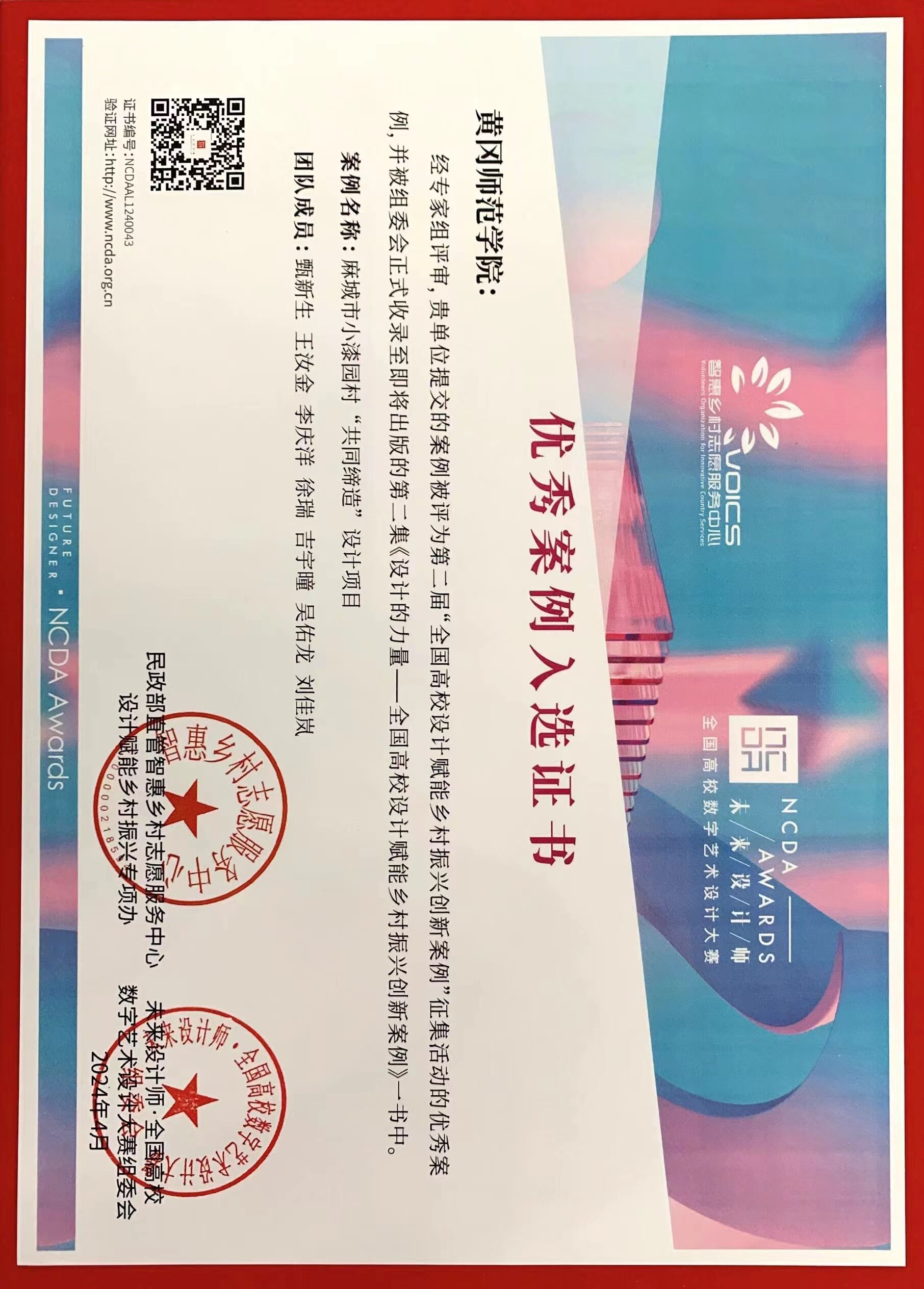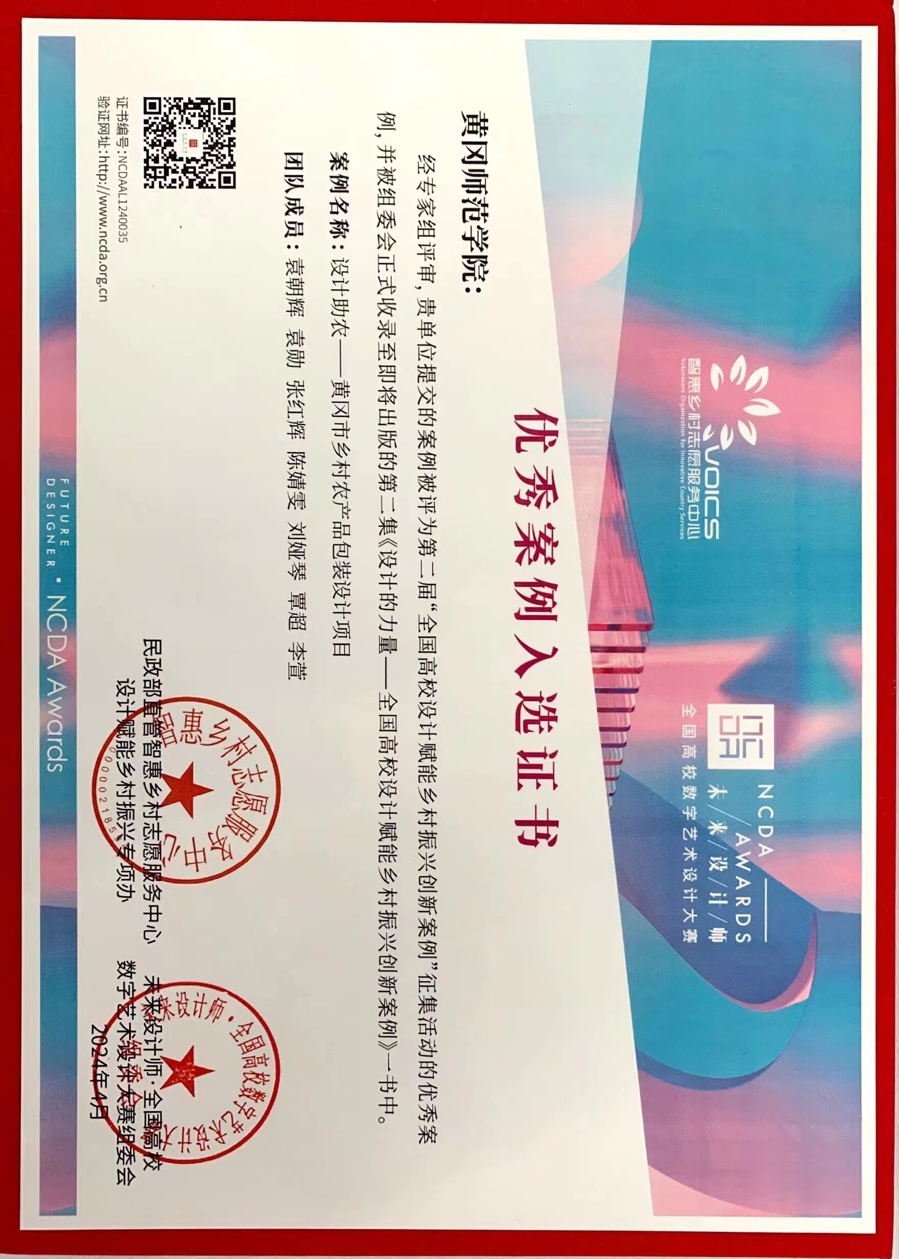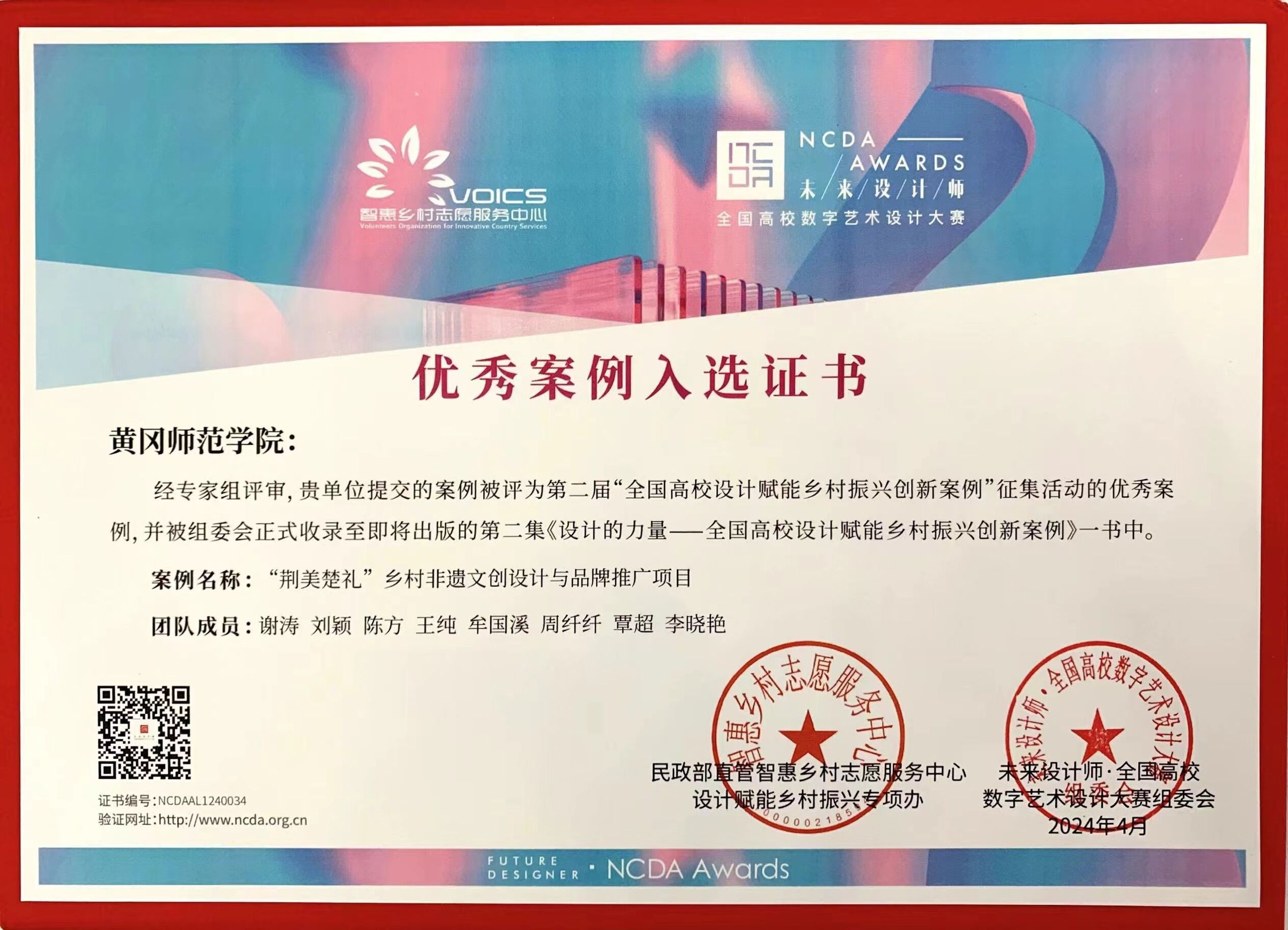4月15日,第61届高等教育博览会“设计赋能乡村振兴创新教育学术活动”在福州海峡国际会展中心召开,公司袁朝辉教授、谢涛副教授、甄新生副教授、袁勋副教授、张红辉副教授、刘颖老师、陈方教授等师生团队的《“荆美楚礼”乡村非遗文创设计与品牌推广项目》《麻城市小漆园村“共同缔造”设计项目》《设计助农——黄冈市乡村农产品包装设计项目》3个创新设计案例入选第二届“全国高校设计赋能乡村振兴创新案例”,公海贵宾会员检测中心荣获“2023年度设计赋能乡村振兴志愿服务先进单位”荣誉称号。